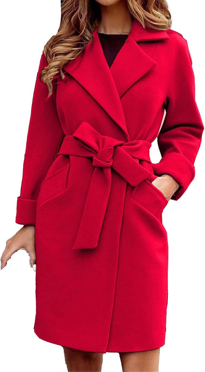 Womens Winter Coat 2024 Fall Casual Notch Lapel Single Breasted Belted Midi Peacoat with Pockets