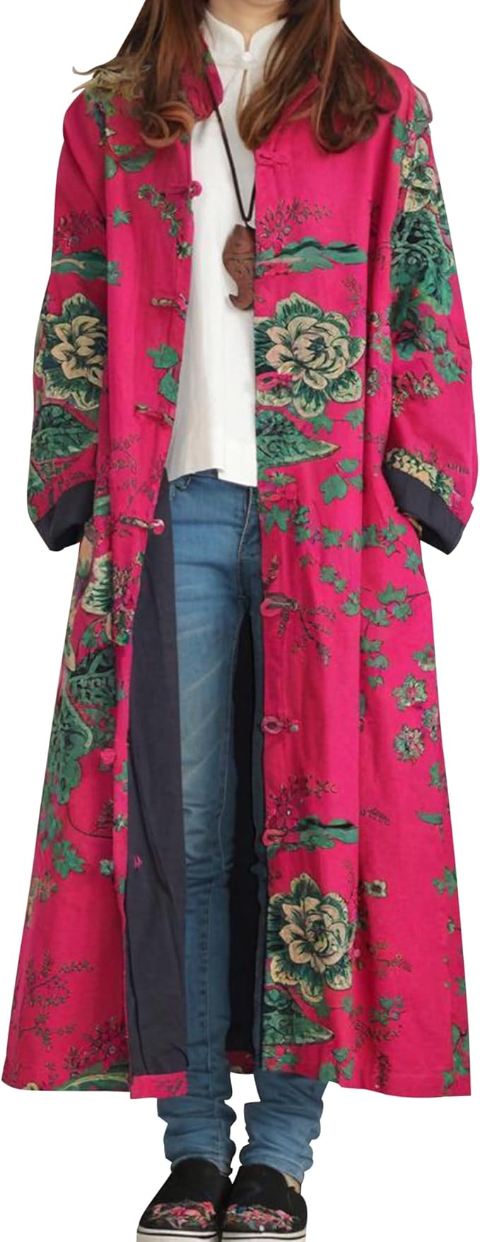 LZJN Women's Trench Coat Long Cotton Linen Floral Print Jacket Cottagecore Clothing Casual Plus Size multicolored Outerwear