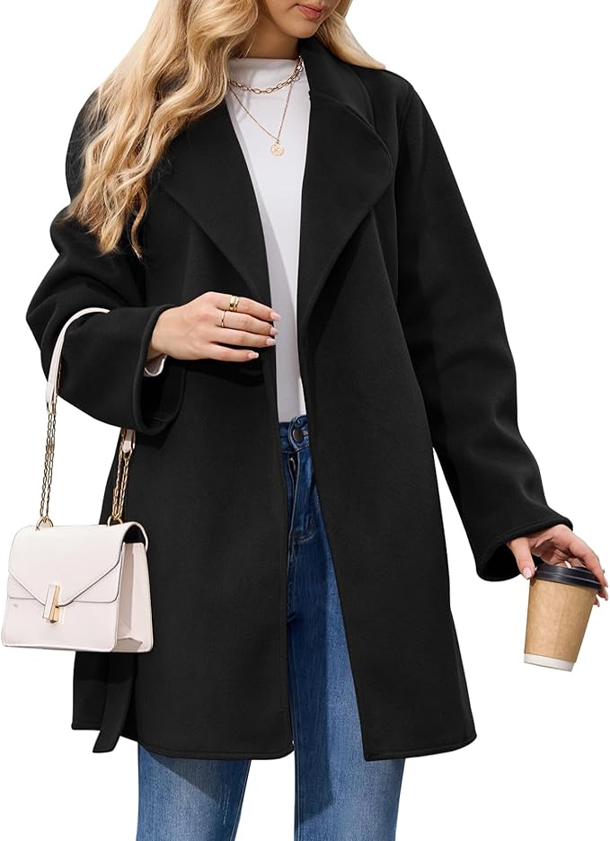 Womens Lapel Collar Pea Coat Open Front Overcoat Belted Long Jacket Outerwear
