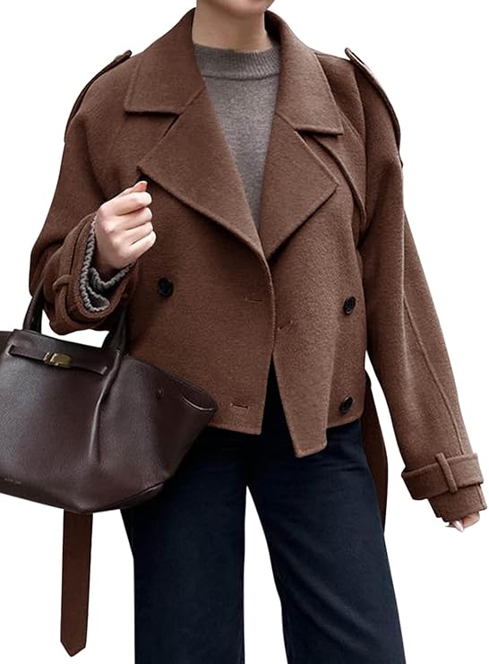 Womens Cropped Pea Coat Double Breasted Dressy Casual Notched Lapel Wool Blend Overcoat with Belt