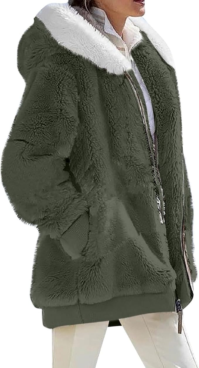 Womens Winter Coats Fuzzy Fleece Jacket Hooded Color Block Patchwork Cardigan Coat Warm Outerwear With Pocket