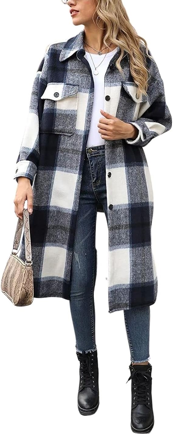 Kwoki Women's Long Plaid Shirt Jacket Casual Loose Fit Button Down Lapel Wool Blend Trench Coat Shackets
