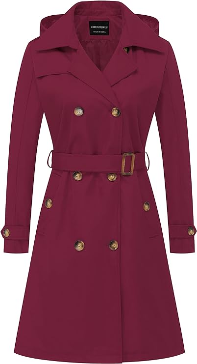 Women's Trench Coat Double-Breasted Classic Lapel Overcoat Belted Slim Outerwear Coat with Detachable Hood