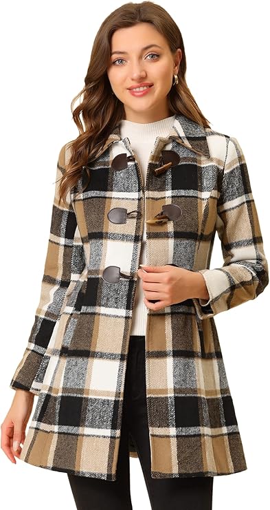 Women's Christmas Toggle Outerwear Turn Down Collar Winter Plaid Duffle Coat