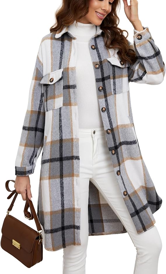 Womens Plaid Shacket Brushed Flannel Shirt Jacket Mid Long Wool Blend Tartan Coat