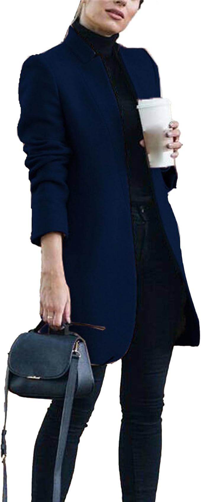 Womens Stand Collar Wool Blend Coats Casual Warm Open Front Cardigan Trench Overcoat Mid Long Slim Fit Jackets