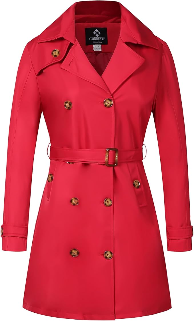 Trench Coats for Women, Double Breasted Mid-Length Belted Overcoat Long Dress Jacket with Detachable Hood