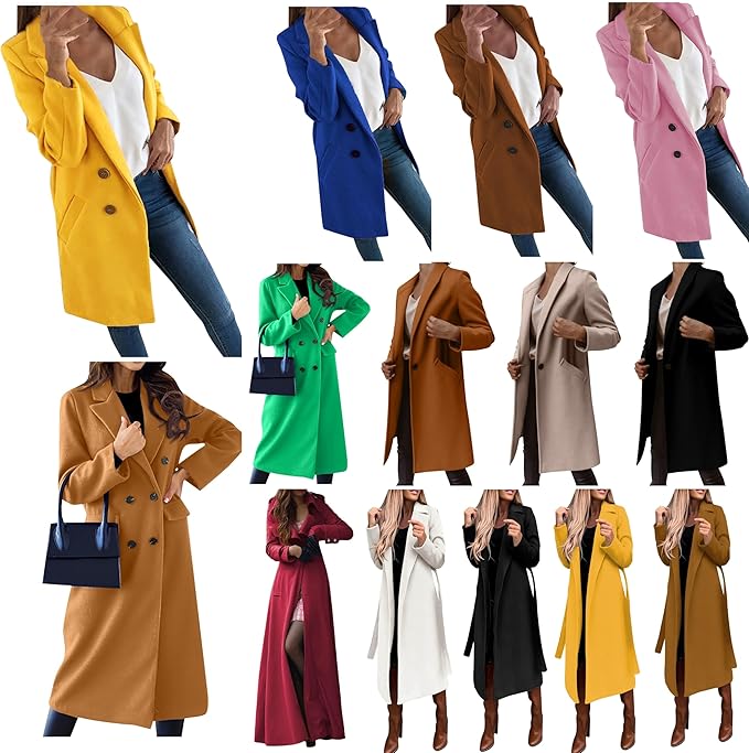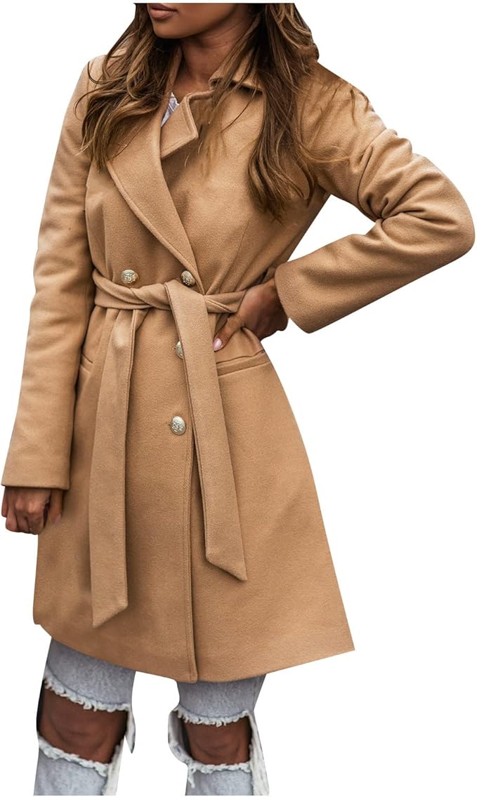 Womens Pea Coats Fall Long Trench Coat Double Breasted Button Down Lapel Belted Peacoat