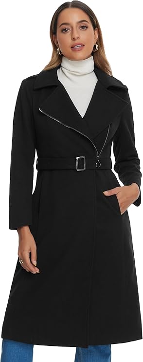 Women's Winter Coats Zipper Front Notched Collar Belted Warm Blend Trench Coat