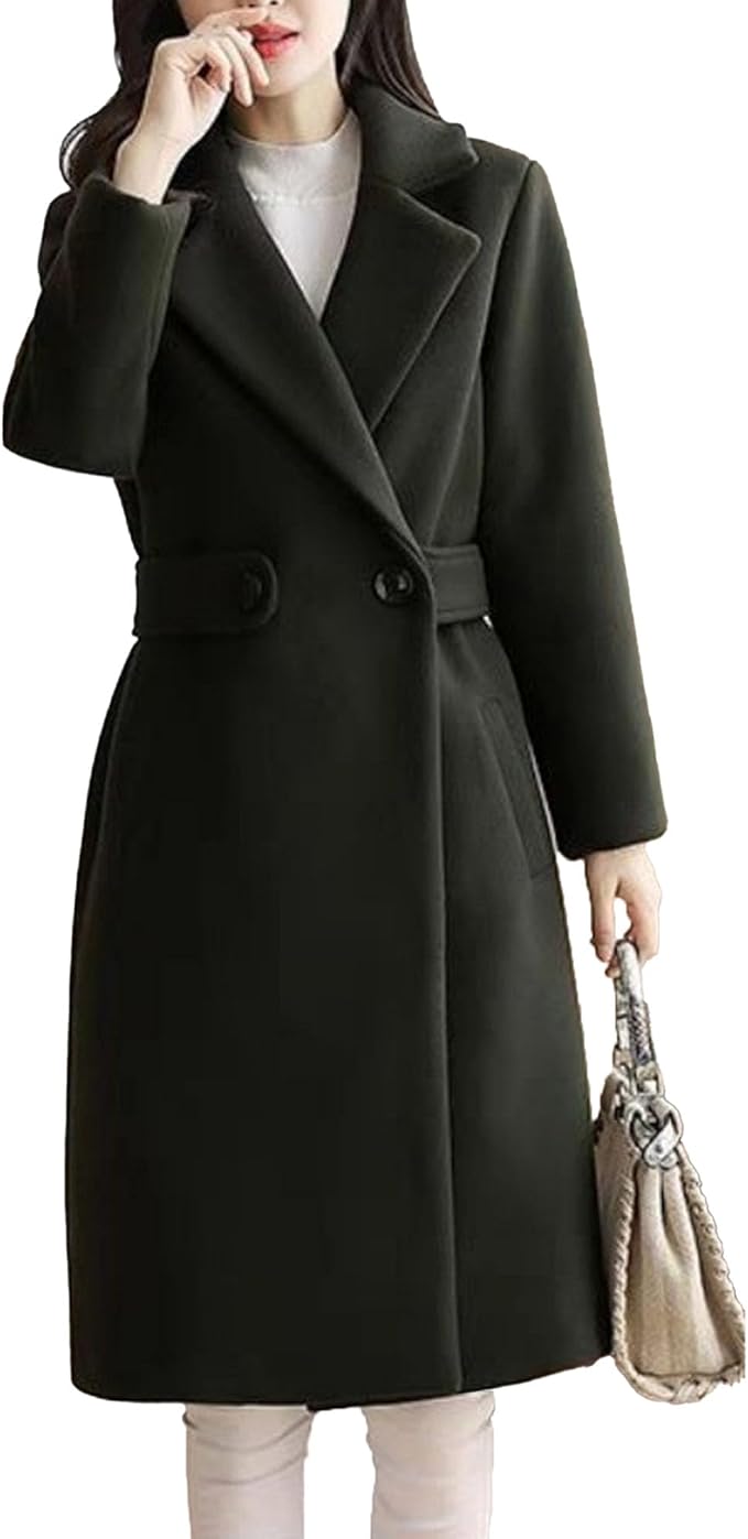 Women's Double Lapel Thigh Length Button Front Wool Coat with Belt