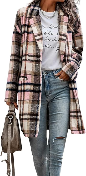 Women 2023 Plaid Jacket Mid Length Trench Coat Fall Light Coat with Pockets