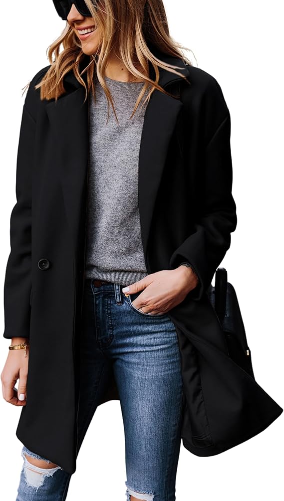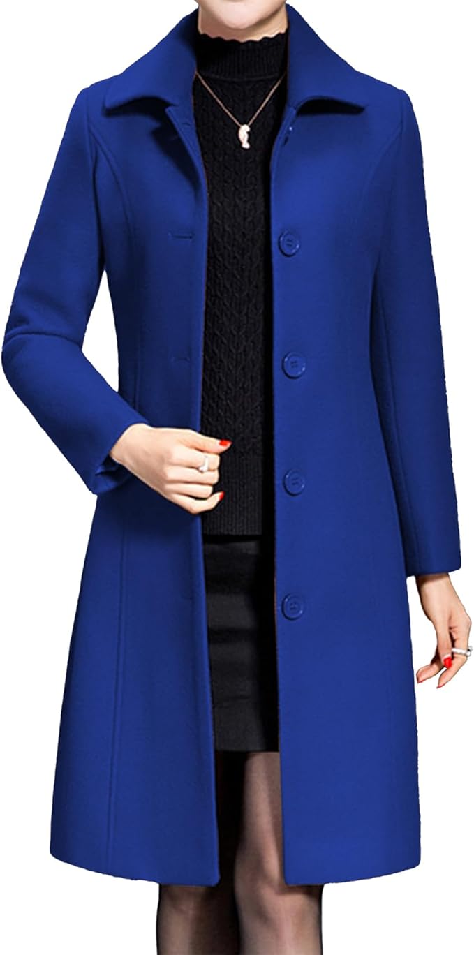 Womens Wool Blend Peacoat Turn Down Collar Single Breasted Elegant Overcoat Long Sleeve Outerwear with Pockets