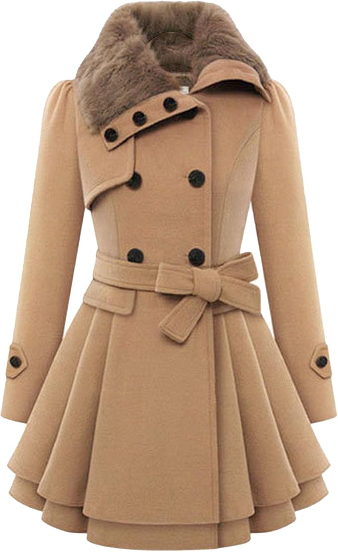 Womens Lapel Faux Fur Collar Wool Blend Trench Coat Vintage Double Breasted Long Jacket Casual Coat with Belt