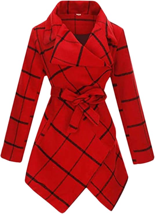 Trench Coat Women Turn Down Collar Wrap Coat Wool Blend Grid Belted Outwear Asymmetric Hem Winter Pea Coats