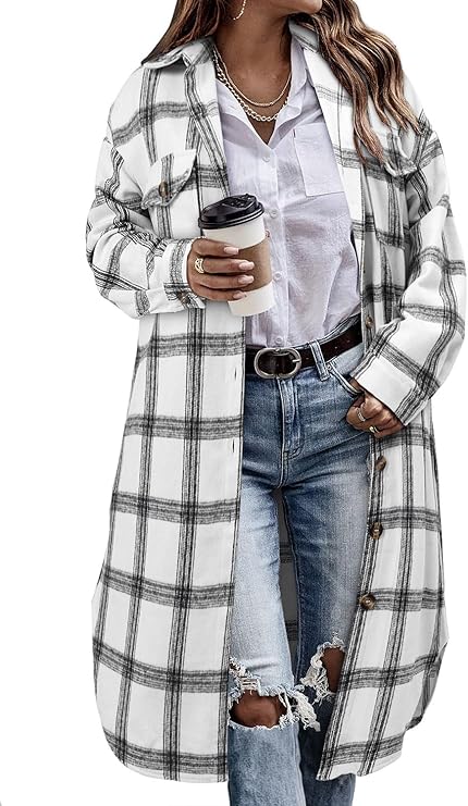 Womens Plaid Shacket Jacket Long Corduroy Shirt Casual Lapel Button Down Flannel Trench Coats