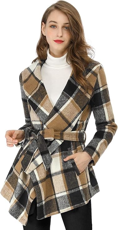 Women's Turn Down Collar Asymmetric Hem Thin Plaids Wrap Coat